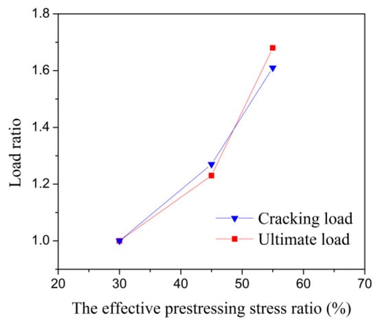 The ultimate load and midspan deflection of the partially prestressed specimens were significantly enhanced, and the load–deflection curves also showed a trilinear trend: