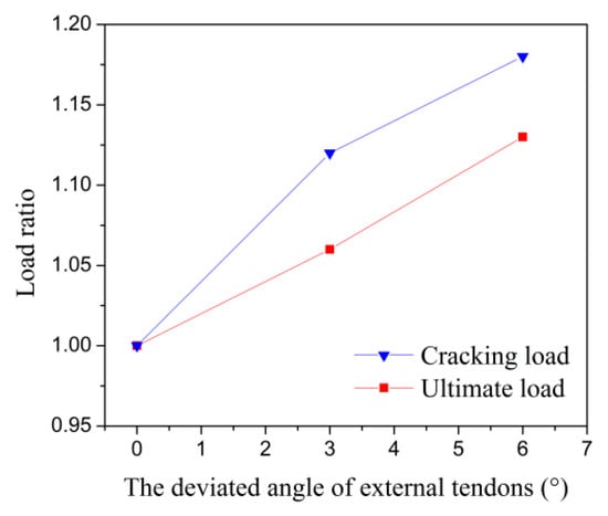 ACI 440.4R-04 depicts that special deviator should be designed to consider the reduction in tensile strength of the external FRP tendons under flexural tension. Specifically, when the deviated angle is 5°, the strength reduction of CFCC® tendons, which have a curvature radius of 24D (around 300 mm), would be at most 5%ffp [43]. To investigate the flexural-tension performance of CFRP tendons cooperate with deviators in the midspan, which have a curvature radius of 32D (400 mm), three different deviated angles αp were applied in the present study. Compared to specimen E30-P85-D0-L3 with horizontal tendons, the ultimate capacity of specimens E30-P85-D3-L3 and E30-P85-D6-L3 with harped tendons merely increased by 6.1% and 12.9%, as shown in Figure 16. The deviated prestressing tendon enhanced the flexural behavior of the beams, due to the increasing ultimate stress fu in CFRP tendons. No evidence for damages at the deviating points or the tendon-anchor junctions was observed in each specimen, and thus the external CFRP prestressing system exhibited an excellent flexural-tension performance.