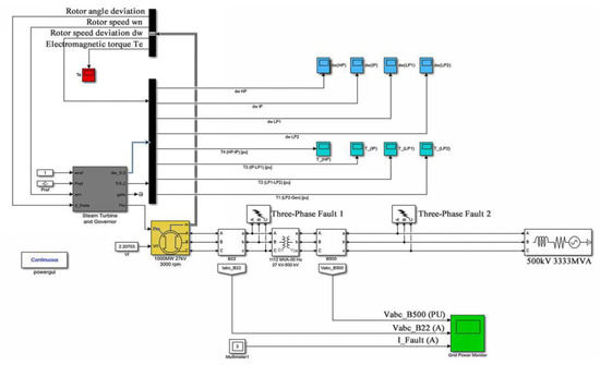 The most common fault in power systems is a short-circuit. Short-circuits are mainly divided into three-phase short-circuits, two-phase short-circuits, single-phase short-circuits. The probability of a three-phase short-circuit is not high, but it is the most dangerous fault in a power system. The most common fault is a single-phase grounding short-circuit, accounting for about 65–70% of total short-circuit faults. MATLAB is used for modeling and simulation analysis, which avoids the complicated and long programming process, and the simulation results are close to the actual behavior of the system, so this is an ideal tool for power system analysis. It is convenient, practical and flexible, providing an effective research platform for power system researchers. Simulink is attached to MALAB as a tool library, which is a software package for modeling and simulating dynamic system. It provides a block diagram modeling interface for users, which can complete the modeling of continuous systems, discrete systems, and continuous and discrete mixed linear and nonlinear systems. It also supports the simulation and analysis of the dynamic performance of multi-rate systems with multiple sampling rates. MATLAB is an engineering calculator represented by matrix operation. The integrated SIMULINK model library is embedded with the Simscape Component and Specialized Technology module library, which is mainly developed for power system simulation, including an electromechanical system module, a power module, a controller switching library, etc. [50]. The electrical short-circuit fault model of a 1000 MW turbine generator set is built by calling the synchronous generator model and steam turbine model in the Simscape Component calculation library, as shown in Figure 2. The power generation model takes an actual 1000 MW unit as the research object, and builds the overall power system simulation circuit, including the steam turbine, synchronous generator, transformer, and other main modules. The right side is provided with a constant 500 kV AC power supply to simulate the power grid. On the left side, the turbine and generator are coaxial through the series module of steam turbine and synchronous generator, which constitutes the actual power production turbine generator model. The generator output is 27 kV AC, and the transformer module is boosted to the same grid voltage. The line contains two fault points, three-phase fault 1 and three-phase fault 2, which are the short-circuit fault point of the generator terminals and the short-circuit fault point of the line of the power grid, respectively.