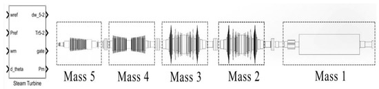 The model of the 1000 MW turbine generator set is built by the steam turbine module embedded in the SIMULINK Toolbox. The module includes the complete steam turbine system and generator system, and integrates five mass blocks, corresponding to the high-pressure rotor, the medium-pressure rotor, two low-pressure rotors and the generator rotors of the turbine generator set, all connected together through the coupling. Coupling refers to a device that connects two shafts or shafts with rotary parts, which rotates in the transmission from motion into power and which does not disconnect under normal conditions. Sometimes, it is also used as a safety device to prevent the connected parts from being subjected to excessive load, which plays the role of overload protection. Couplings can be divided into rigid couplings and flexible couplings. The five mass blocks are connected by rigid couplings. There is no relative displacement in the radial and axial directions of the two rotors, which is conducive to keeping the rotor center unchanged, as shown in Figure 3.