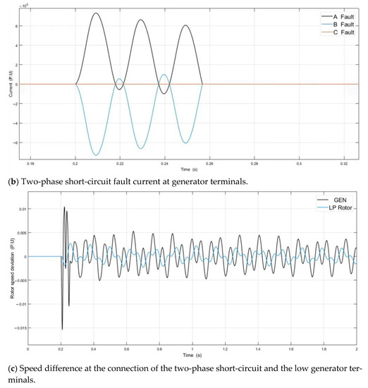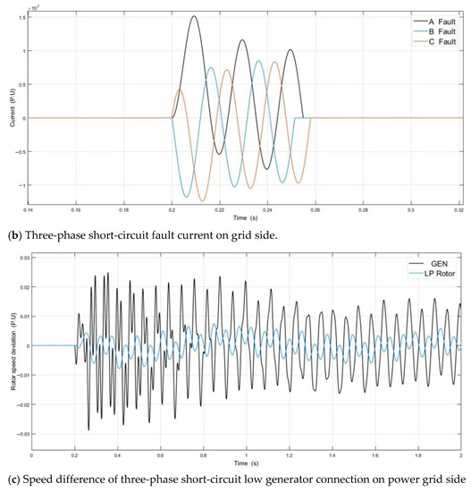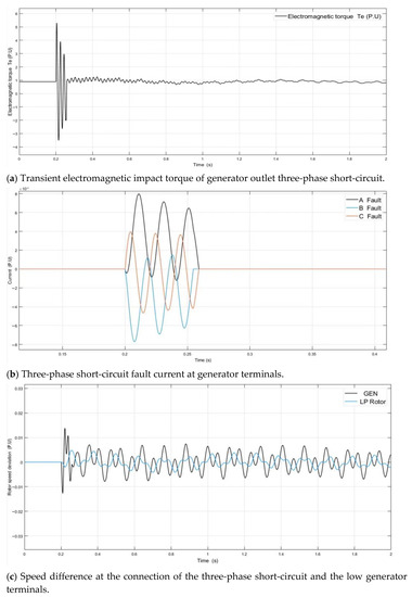 The generator outlet short-circuit fault is realized by the three-phase fault module in the SIMULINK Toolbox, and the position is shown in Figure 1. The generator terminals short-circuit fault 1. The generator is set to impart 80% load before the fault occurs, and the system’s simulation time domain is 2 s. The short-circuit fault between phases A and B occurs at 0.2 s, and it is removed at 0.25 s. The short-circuit time is 0.05 s. The algorithm ode23tb is used to solve the unit value of electromagnetic torque, fault current and velocity difference at the connection of the low-voltage generator under the transient fault, as shown in Figure 6 [55,56].