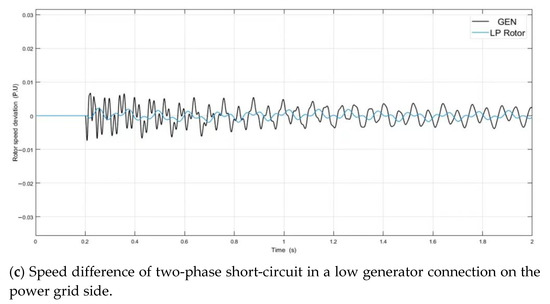 Figure 8c shows that the speed fluctuation frequency of the connection between the low-voltage rotor and the generator is higher than that of the generator terminal’s short-circuit fault, but the transient speed difference is less than that of the generator terminal’s short-circuit fault, and the maximum fluctuation is below 30 rpm.