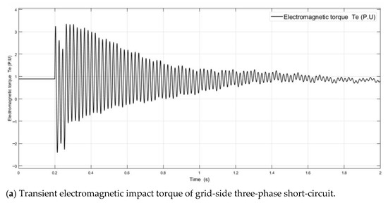 As shown in Figure 9a,b, the electromagnetic transient impact torque of the three-phase short-circuit fault on the grid side is less than that of the two-phase short-circuit fault on the grid side, so the amplitude of the transient electromagnetic torque fluctuation generated at the lifting time is greater than that of the two-phase short-circuit fault on the grid side. The subsequent attenuation disturbance time is longer than the generator terminal’s short-circuit fault time.