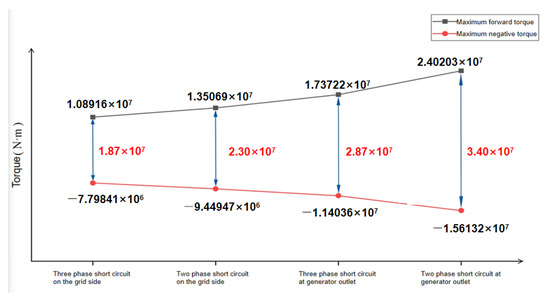 The simulation results for the above four short-circuit faults are shown in Figure 10, for the maximum transient electromagnetic alternating torque.