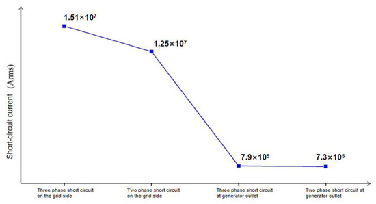 The impact current generated by a three-phase short-circuit at different fault locations is greater than that of a two-phase short-circuit, and the impact current generated by the grid’s short-circuit fault is much larger than the impact current generated by the generator terminal’s short-circuit fault. A short-circuit fault occurring near the mechanical power grid has a more severe impact on the power grid than the generator terminal’s short-circuit fault.