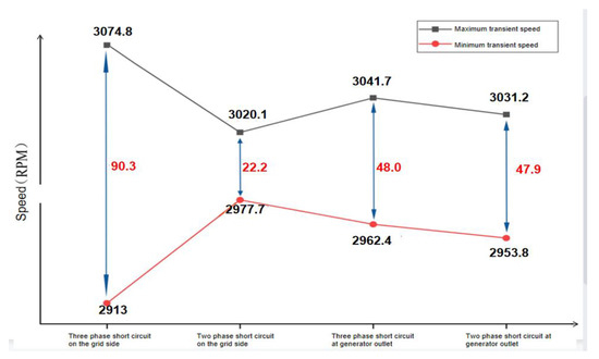 The simulation results of the speed difference between the low-voltage rotor and the generator rotor show that the transient speed difference caused by the three-phase short-circuit on the grid side is the largest, and the transient extremum fluctuation is 74.8 rpm. In contrast, the speed fluctuation caused by the two-phase short-circuit on the grid side is the smallest, and the transient extreme fluctuation is 20 rpm. The velocity fluctuation under the above four short-circuit fault conditions is shown in Table 6, and the corresponding velocity fluctuation curve is shown in Figure 12.