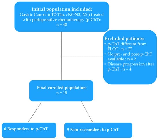 Between January 2019 and November 2020, a total of 48 patients underwent a gastrectomy with perioperative chemotherapy for gastric adenocarcinoma at our institution. Twenty-seven patients who underwent chemotherapy regimens other than FLOT, two patients without available pre- and post-perioperative chemotherapy CT scans, and four patients who had their radiological disease progression assessed with CT scans after perioperative FLOT therapy were excluded from the study. Fifteen patients fulfilling the study criteria were included in the study. Patients were divided into two groups: 9 (60%) non-responders to p-ChT (TRG1a-1b) and 6 (40%) responders to p-ChT (TRG2-3) (Figure 2).