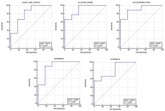 Radiomics features of pre-p-ChT CT examinations showed significant differences between responders and non-responders for Shape, GLCM, First order, and NGTDM features. In particular, the extracted radiomics parameters showed significant differences in LeastAxisLength (Shape feature; p = 0.017), Cluster Shade and Autocorrelation (GLCM features; p = 0.007 and 0.005, respectively), Skewness (First order feature; p = 0.012), and Strength (NGTDM feature; p= 0.049). The diagnostic performance of these features was tested with ROC curves showing AUCs of 0.815 for LeastAxisLength, AUC of 0.907 for both Cluster Shade and Autocorrelation, an AUC of 0.889 for Skewness, and an AUC of 0.815 for Strength (all p < 0.011). Complete results are shown in Table 3 and Figure 3.