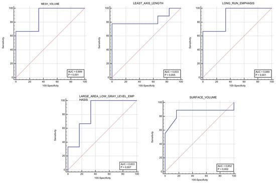 ΔRadiomics values showed significant differences between responders and non-responders for Shape, GLRLM, GLSZM, and NGTDM features. Specific features include MeshVolume, LeastAxisLength, and SurfaceVolume (Shape features; p = 0.012, 0.036, and 0.020 respectively); LongRunEmphasis (GLRLM feature; p = 0.039); LargeAreaLowGrayLevelEmphasis (GLSZM feature; p = 0.017); and Contrast (NGTDM feature; p = 0.049). Further, ROC curve analysis showed significant results for the abovementioned ΔRadiomics features with an AUC of 0.889 for MeshVolume, 0.833 for LeastAxisLength, 0.852 for SurfaceVolume, 0.889 for LongRunEmphasis, 0.833 for LargeAreaLowGrayLevelEmphasis, and 0.796 for Contrast (all p < 0.007). Full results including sensitivity, specificity, and confidence interval (CI) are reported in Table 4 and Figure 4.