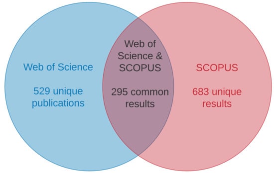 The primary sources of information for the study were Clarivate Analytics’ WoS and Elsevier Inc.’s SCOPUS databases. Results of the performed advanced search are shown in Table 1 for the search query listed below. The investigation was carried out in the Topics (TS) section of WoS and the TITLE-ABS-KEY section of SCOPUS. The search was conducted with no time constraints and for “All document types” and “All languages.” Because the investigation was completed on the 18th of May 2021, the statistics for the year 2021 are only partial.