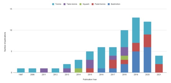 All four of the most well-known racket sports have been taken into consideration in the reviewed papers. There have also been some publications that have mentioned a novelty sport called paddle tennis, as well. A total of 65 publications has been evaluated.