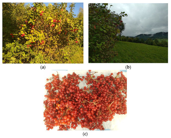 Matured Viburnum opulus fruits (Figure 1a,b) were harvested at the end of September 2020 in the southeastern part of Poland in Subcarpathian Voivodeship (Liszna near Sanok). The collection site was pollution-free, located far from industrial places. The collected fruits (Figure 1c) were stored for one week at a temperature of −18 °C and next they were washed and cleaned, and their seeds were removed. The fruits were ground in a mortar. The pulp was poured onto plates and freeze-dried for two days (LABCONCO Corporation, Kansas City, MI, USA). The lyophilized fruits were vacuum sealed and stored at −18 °C until use. The entire analysis described was based on lyophilized fruits.