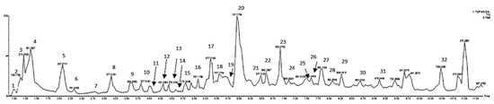 We also observed small amounts of compounds that are not presented in the table. These were: syringetin-3-O-galactoside, hydrate (RT 2.791 min, m/z 525.2838), vitexin-2″-O-rhamnoside (RT 3.808, m/z 413.2820), quercetin-3-galactoside-6″-rhamnoside-3‴-rhamnoside (RT 3.808/9.457; m/z 771.2408/769.2241), (+)-catechin hydrate (RT 4.307, m/z 291.3129), and quercetin-3-O-alpha-L-rhamnopyranosyl(1-2)-beta-D-glucopyranoside-7-O-alpha-L-rhamnopyranoside (RT 5.547, m/z 757.1452) [34,35].
