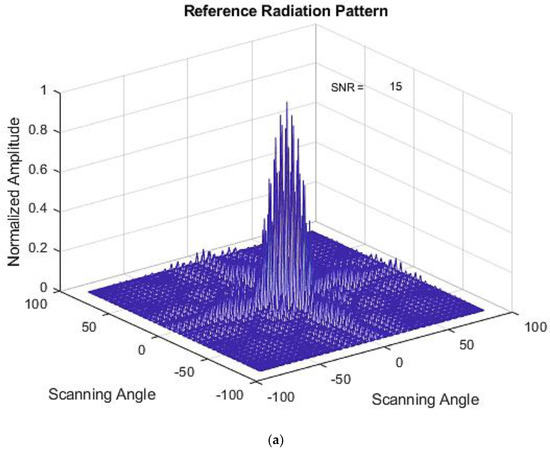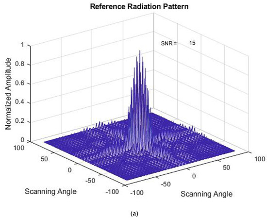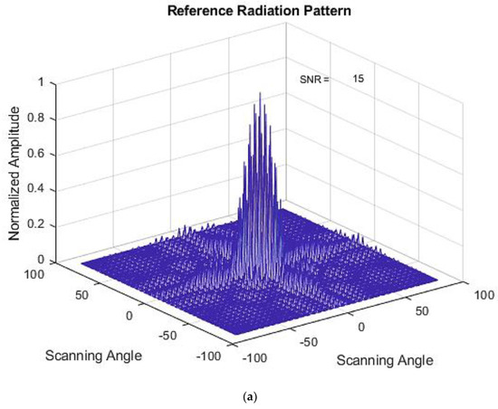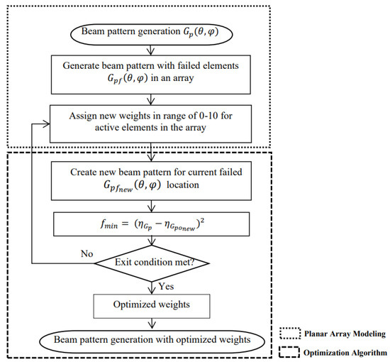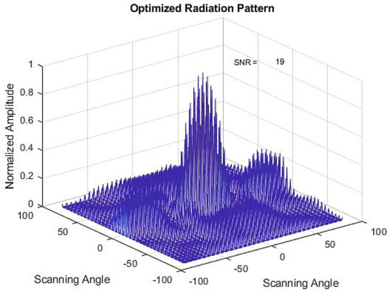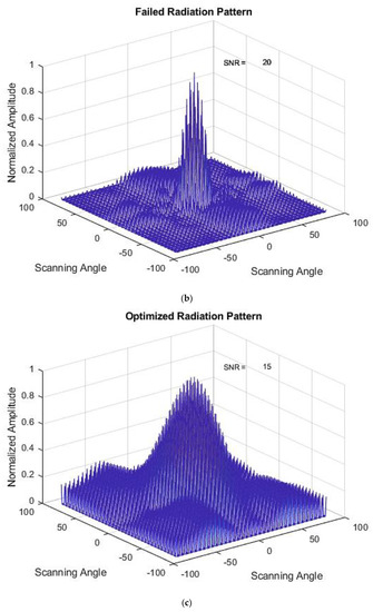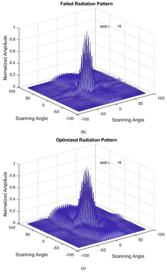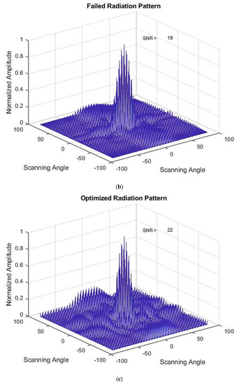 Then, the failed radiation pattern was restored by optimizing the remaining active elements of the array. The optimization methods described in Section 2.2 were applied to the failed radiation pattern following the optimization flow. New weights for the remaining working element were assigned to calculate SNR for the current radiation pattern. The objective function is evaluated as in (10). The objective function minimizes the error between the current radiation pattern and the reference radiation pattern without any failed elements in the array. The iteration continues until the optimization meets the exit condition where the optimization stops.