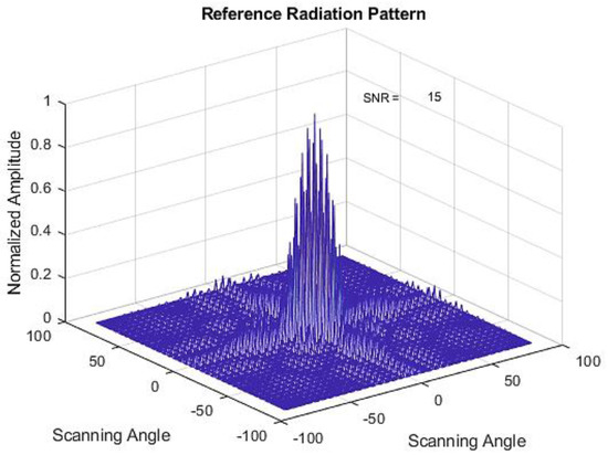 The methodology developed was to examine a planar array with 8 × 8 and 6 × 6 elements with interelement distance. Equation (3) was used to generate a beam pattern of reference radiation pattern without any failed elements in an array. Figure 4 shows an example of a reference radiation pattern for 8 × 8 elements.