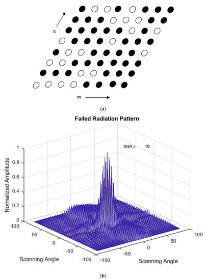 Next, the failed radiation beam pattern is generated with Equation (8) by designating the failed element’s weight as zero. It is assumed that the failed element(s) do not contribute to the radiation pattern. In this analysis, the probability of faulty elements is fixed to a maximum of 25 elements (varies on case basis) in an 8 × 8 array and 12 elements for a 6 × 6 array. Figure 5a shows 25 elements failed in a random location radiation pattern and its failed radiation pattern in Figure 5b.