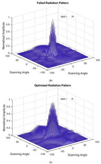 The PSO method results for the same type of failure are shown in Figure 9a–c. The optimized weights using this method are shown in Table 5. Here, the method has matched the SNR value of the optimized radiation pattern with the reference radiation pattern. The main lobe level is also maintained. From an SNR value of 19 in the failed radiation pattern, the method has successfully reduced the value to 15 in the optimized radiation pattern.