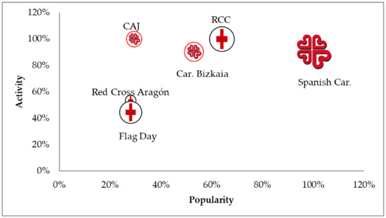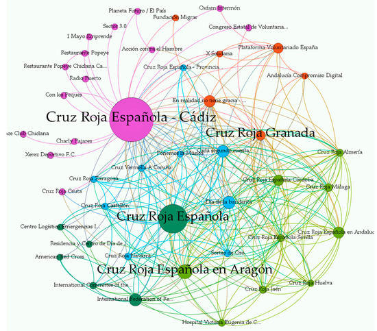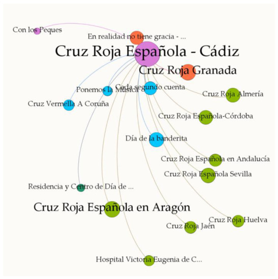 There is a common thread running through the fabric of the two Facebook organizations. For example, companies such as Carrefour cooperate with both RCC and CAJ in collecting food or toys. Specifically, 46 companies collaborate with RCC [88] and 110 with CAJ [89]. A reason for this was explained by CAJ’s communications manager, who commented that on Facebook she tends to like the posts and not the pages. Another fact to highlight regarding the identified stakeholders is that CAJ has almost twice as many pages in its network as RCC.