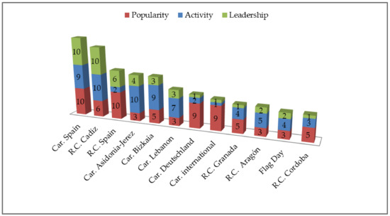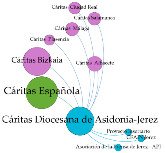 - Selection of organizations. The selected organizations were RCC and CAJ, as they are among two of the NGDOs with the largest number of delegations in the province of Cadiz. RCC is a non-denominational organization that had 12 local assemblies in 2019, with more than 200 members and 100 volunteers. CAJ has nine archpriesthoods distributed in the area north of the Guadalete River in the province of Cadiz. They are also registered with the Spanish Agency for International Development Cooperation and are considered “qualified” organizations in that they have passed an accreditation process that certifies their experience and capacity. We restricted the scale of our study, as more focused studies can yield valuable insights in particular contexts (small scales). It is essential to know how NGDOs use social networks in a local environment since these instruments can innovatively provide services, external relations, and access to knowledge beyond organizational boundaries. Several studies using the SNA methodology have used a small-scale approach to sample selection. In this regard, the study by Wyllie et al. (2016) [55] is of interest, who found that small-scale SNA in social networks reveals valuable information about relationship management for nonprofit service organizations. Moreover, Tiago et al. (2018) [75] conducted a study to examine the social media strategies of three cruise lines over three years, analyzing the network structures on Facebook and Twitter and demonstrating the value of the STAR (storytelling, triggers, amusement, and reaction) model for improving social media activities. In culture, Lindell (2017) [58] developed a study on the usefulness of Bourdieu’s social theory in digital social network research. To this end, he conducted a case study focused on the Royal Dramatic Theatre in Sweden, whereby he found that a network analysis of a group of institutions in social networks can begin to uncover the breadth or scope of a social field, which, according to the author, is rare in empirical field research.