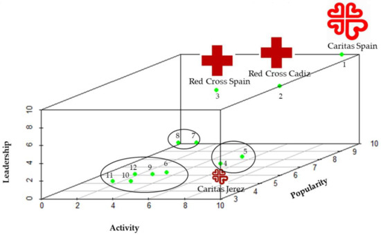 - Analysis and visualization of results. Once the data were obtained they were examined and visualized using a Gephi version 0.9.2. software package [84] and Rstudio version 4.0.3 [85]. Gephi is open-source software for graph and network analysis to display large networks in real-time, speed up exploration, and produce valuable visual results. It provides broad access to network data and allows for spatializing, filtering, navigating, manipulating, and clustering. The ForceAtlas2 algorithm was applied to organize the nodes spatially in terms of the two opposing forces of repulsion and attraction between the nodes. The nodes that had more connections in common were attracted to each other, and those that did not have connections in common were pushed away from each other [86]. In general, nodes with something in common also “like” each other more often than other nodes, so the ForceAtlas2 design brings them together into groups. Examining the network and these groups might reveal ideas about shared values and interests. Finally, we used the R-Studio program and the Scatterplot3d package [87] to build a 3D map to respond to the objective of positioning organizations according to their levels of leadership, activity, and popularity.