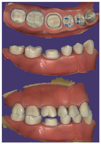 - Muta, S.; Ikeda, M.; Nikaido, T.; Sayed, M.; Sadr, A.; Suzuki, T.; Tagami, J. Chairside fabrication of provisional crowns on FDM 3D-printed PVA model. J. Prosthodont. Res. 2020, 64, 401–407. [Google Scholar] [CrossRef] [PubMed]