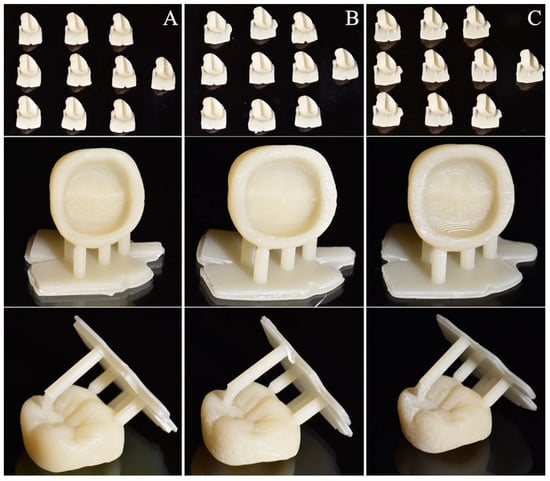 3D-printed interim crowns ((A): 20 µm crowns; (B): 50 µm crowns; (C): 100 µm crowns).