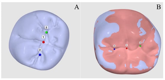 (A): Reference points determined for the superimposition of STL files (1: Central fossa; 2: Distal triangular fossa; 3: Mesial triangular fossa), (B): Superimposition of the Test-scan STL over the RS-STL by using these points.