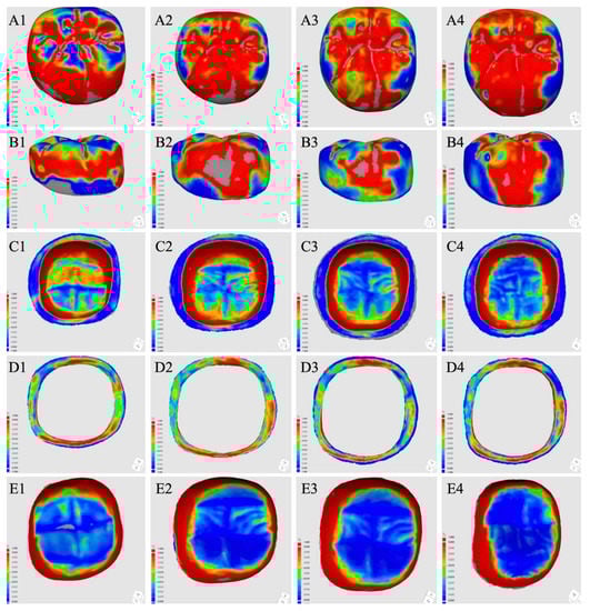 Color maps generated by the superimposition of the milled (1), 20 µm (2), 50 µm (3), and 100 µm (4) crown meshes over reference data ((A): Overall RMS; (B): External RMS; (C): Internal RMS; (D): Marginal RMS; (E): Intaglio Occlusal RMS).