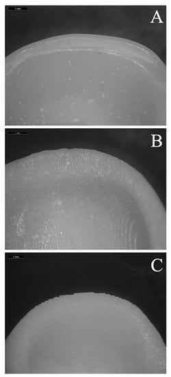 For margin quality comparison, each crown was randomly numbered by an independent individual, and then visually examined with an optical microscope (Zeiss) under ×60 magnification by a single operator (G.Ç.) who was blinded about the numbering, and a grading system from 1 to 3 was used as performed in a previous study [29]. Grade 1 crown margins indicated rough edges similar to layers. Grade 2 crown margins indicated slightly rough edges similar to waves. Grade 3 crown margins indicated smooth edges (Figure 5). Margin quality was examined at each margin location (buccal, lingual, mesial, and distal) of each crown, and the average was calculated for each printed or milled crown.