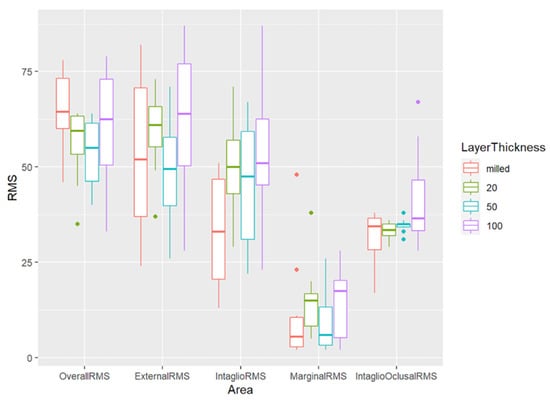 Box-plot graph of the RMS values of milled and 3D-printed interim crowns according to different surfaces.
