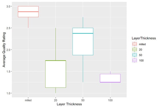 Average margin quality of the crowns showed significant differences (Figure 7); based on the 3-point scale, milled crowns presented higher quality than the others (p < 0.001 vs. 20 µm, estimated difference in means: 1.25 points; p = 0.001 vs. 50 µm, estimated difference in means: 0.68 points; and p < 0.001 vs. 100 µm, estimated difference in means: 1.53 points).