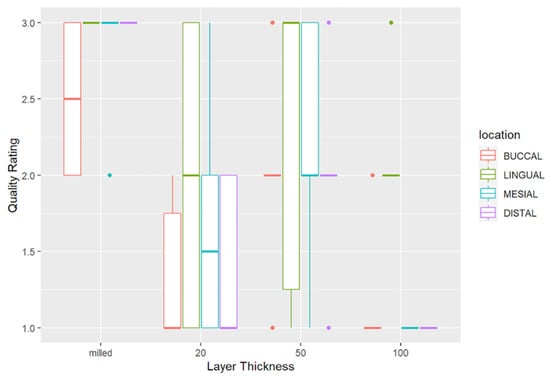 No significant differences were found between the quality of the margins at different locations for 20 µm (p ≥ 0.121) and 50 µm (p ≥ 0.765) crowns. However, margin quality of milled (p = 0.002) and 100 µm (p < 0.001) crowns were significantly affected by the margin location. The mesial, distal, and lingual margin quality of the milled crowns was similar (p ≥ 0.885), while buccal margin quality was inferior to that at other locations (p ≤ 0.03). For the 100 µm crowns, lingual margin quality was higher compared with other locations (p < 0.001); the differences among other locations were nonsignificant (p ≥ 0.831). The margin quality in control and each layer thickness groups according to the margin location is presented in Figure 8.