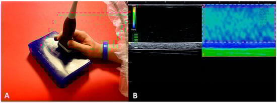 (A) Ultrasound transducer placement over the phantom. (B) Ultrasound image showing the phantom and measuring area (pink) above the internal artificial vessel.