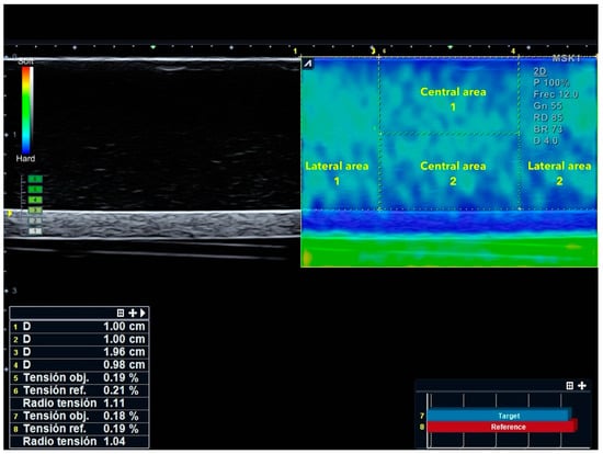 Once captured, all the images were assessed using offline measurement tools of the US equipment to calculate the SR. Relative SRs were calculated as the stiffness of the reference area divided by the stiffness of the comparator area. Two different SRs were calculated as follows (Figure 2):