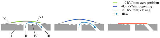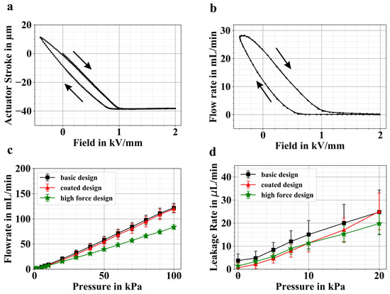 Figure 9a depicts an exemplary measurement of the microvalve actuator stroke. The change in slope at approximately 1 kV/mm shows the actuator touch down on the valve seat. For electric fields <1 kV/mm, open state actuator movement of more than 50 µm in total is achieved, and the occurrence of piezoelectric hysteresis becomes apparent. Closed state starts at electric fields beyond 1 kV/mm, where further downwards displacement is blocked, and the contact pressure of the valve diaphragm and the valve seat increases. Comparison of the three variants of the microvalve design reveals no significant difference in total actuator stroke (Table 2). The slight difference in the stroke of the coated microvalves could be explained by the reduced distance of the valve diaphragm to the valve seat by the added coating.