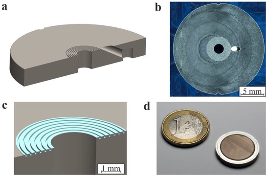 (a) Model of the NO valve body incorporating two fluid ports and micromachined trenches. (b) Light microscope picture of the micromachined valve steel body. (c) Model of the valve seat coated with Parylene-C. (d) Photograph of an assembled microvalve after laser welding and piezoelectric actuator bonding next to a Euro coin. The microvalve has a diameter of 20 mm and a height of 2.6 mm.