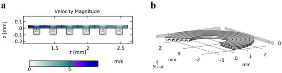 In order to investigate the impact of the geometrical dimensions of the circular trenches on the fluidic resistance of the valve seat and, hence, on the potential improvement with respect to its fluidic performance, we perform a finite element analysis (FEA). To this end, we compare the fluid flow through an axisymmetric, annular channel with concentric trenches to the flow between two unstructured flat and parallel discs. The used simulation model is shown in Figure 3 and neglects the inlet and outlet tubes. Instead, we assume a radially symmetric outflow in the direction of the trench cavities leaving along the outer rim of the annular channel, which resembles the valve chamber. As an additional simplification, we assume a constant height along the channel. These assumptions overestimate the total flow rate compared to the real geometry. However, as we are interested in the relative changes of the fluidic resistance due to geometrical changes in the trench geometries and compared to the trenchless disc geometry, this is deemed as an acceptable error.