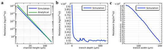 (a) Fluidic resistance as a function of the height of the channel above the trenches. (b) Fluidic resistance depending on the depth of the trenches; the analytically calculated resistance at zero depth amounts to 3.9 × 109 kg/m4s. (c) Fluidic resistance for varying width of the trenches. Again, the resistance at zero width amounts to 3.9 × 109 kg/m4s.