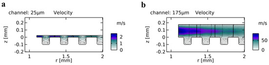 (a) Velocity field of the flow for a channel height of 25 µm. (b) Velocity field of the flow for a channel height of 175 µm. Vortices develop inside the trenches, having impact on the fluidic resistance; however, this impact decreases with increasing channel height.