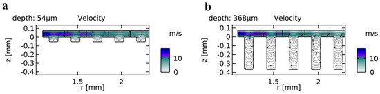 Figure 4b shows the dependency of the fluidic resistance on the depth of the trenches at a channel height of 75 µm. The width of the individual trench is 100 µm. It reveals that the width of 100 μm limits the size of the arising vortices contributing to the resistance. Figure 6a shows the typical flow for shallow trenches with a larger width than depth. In this case, small vortices arise only in the trench corners, and the flow is mostly uniform. Increasing the depth, the fluidic resistance decreases until a depth of the trenches of about 150 µm (c.f. Figure 4b). For this specific trench geometry, the first vortices are now fully developed. Increasing the depth even further leads to more vortices; however, these also affect each other and exert a shear-stress-based resistance towards the neighboring vortices, as can be seen in Figure 6b. The vortices become weaker the deeper they are located in the trench. Due to this, the resistance does not change much for larger trench depths and saturates at an about 20% lower value than the analytically calculated value for a channel between two parallel discs without trenches.