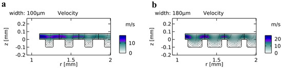 (a) Flow field for a width of the trenches of 100 µm. (b) Flow field for a width of the trenches of 180 µm, where no vortex generation is observed.
