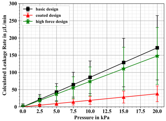 Figure 8 depicts the pressure-dependent leakage rates in closed state of the introduced microvalve designs based on the analytical leakage model derived in Section 2.3. The depicted standard deviation is a result of the calculated propagation of manufacturing tolerances and uncertainties in material properties.