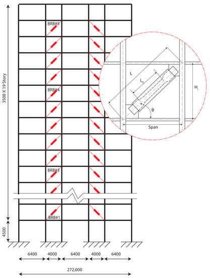 The design guideline of buildings with passive control devices, JSSI [32], is used to determine the size and number of BRBs. The JSSI guideline adopts the procedure developed by Kasai et al. (1998) [33] to obtain the necessary stiffness and damping of additional BRBs. The method idealizes the building as an equivalent single degree of freedom (SDOF) system and estimates the amount of additional stiffness and damping of passive control devices according to the target performance level under design earthquake loads. For the current example, the target performance levels are the maximum inter-story drift ratio of less than 1% and the ductility factor of BRBs of less than 7, under the design earthquake and wind loads. Table 2 presents the estimated parameters of BRBs, while the device configuration is shown in Figure 1.