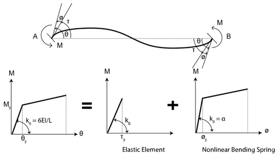 The 20-story steel frame is modeled by finite element software, STERA_3D (STructural Earthquake Response Analysis 3D), which was developed by one of the authors [34]. The beam elements are presented by two nonlinear flexural springs at both ends. The column elements have nonlinear axial springs distributed in the sections of both ends. The steel strength is modified to be 1.1 times more than the nominal strength, and the ratio of post-yield stiffness to the initial stiffness is 0.001. Figure 2 represents the hysteresis behavior of the nonlinear bending spring, which is defined as the moment–rotation relationship under cyclic loadings. The beam–column connection is assumed to be rigid, where the rigid zone length for the beam element is set to be half of the column width. The BRB element, as presented in Figure 3, is defined as a shear spring in a frame with the bilinear hysteresis and initial stiffness, K1, and secondary stiffness, K2.