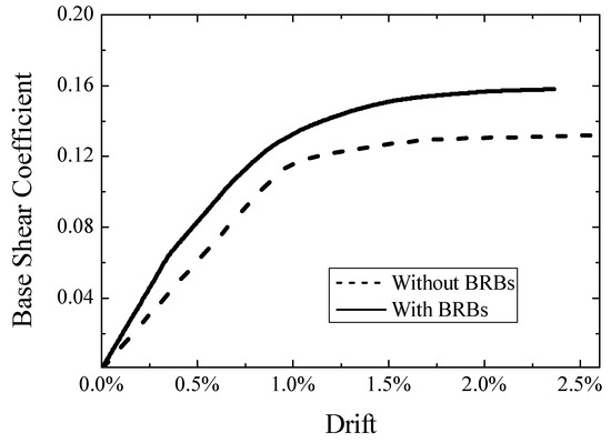 The strength capacity and story drift distribution of the target building are evaluated using the nonlinear static pushover analysis. The model is pushed horizontally until the drift ratio at the equivalent height of the model reached 1/50 using the lateral load distribution given by the Japanese standard [30,31]. The relationship between the base shear coefficient and the drift ratio at the equivalent height of the model, for both cases, without and with supplemented BRBs, is illustrated in Figure 4. The result indicates that the lateral strength of the target frame is increased for the frame with supplemented BRBs by 135%, 115%, and 120% when the building pushover reaches 0.5%, 1.0%, and 2.0% of the drift ratio, respectively.