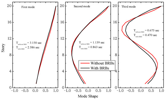 Normalized mode shape of the target high-rise building with and without BRBs devices.