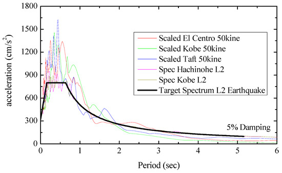 The target frame is analyzed under the design earthquakes and wind loads prescribed in the Japanese standard [30] to validate the design procedure and evaluate the contribution of BRBs. Five sets of earthquake ground motions are considered as listed in Table 3. Three of them are the observed earthquake ground motions scaled to Level 2 to have the maximum velocity of 50 cm/s. The other two earthquakes are artificial earthquake ground motions to have the response spectra to be compatible with the Level 2 design spectrum of the Japanese standard [31] and the phase spectra of historical earthquakes. The acceleration response spectra of selected earthquakes are illustrated in Figure 6. As for the wind load, four sets of design wind load of the different average speeds of 17, 20, 25, and 31 m/s are generated according to the AIJ recommendations [30]. Since the shape of the building is regular, the wind loads are applied at the center of gravity on each floor, while the distribution of the wind loads along the height of the building is decided according to the Japanese standard [31].