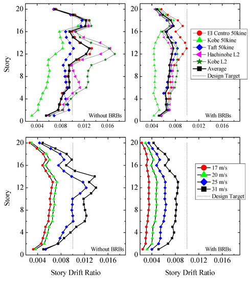 The maximum story drift ratio of the target frame with and without BRBs under the design earthquake and wind loads is presented in Figure 7. For the design earthquake loads, the maximum story drift is controlled to satisfy the 1% design drift, while the average result indicates a 50% decrease in the critical stories compared to the target frame without BRBs. On the other hand, the maximum story drift under the wind loads also indicated an improvement of 50% in contrast to the model without BRBs, which reaches the 1.2% story drift in critical floors, in the case of a design wind load of 31 m/s. Hence, the design procedure is a straightforward tool that can determine the amount of additional stiffness to be provided by BRBs without any iteration to satisfy the design targets.