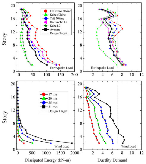 Furthermore, in Figure 8, for the earthquake and wind loads, the maximum ductility factor and the amount of dissipated energy of each BRB along the height of the building are evaluated. For most of the earthquake loads, the ductility factor of BRBs is in the range of the pre-defined design drift, which is considered to be μ = 7, except for the lower stories for which it is exceeded. In the case of design wind loads, the ductility factor is decreasing significantly in upper stories. As for the amount of dissipated energy, in both cases, the BRBs in the upper floors are less effective at dissipating the earthquake or wind loads.