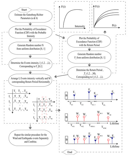 In order to generate the events in the expected lifetime, the proposed procedure initially consists of estimation of the probable earthquake and wind intensity, and subsequently, for the estimated intensity, calculating the probable occurrence with the generation of earthquake and wind events. In the first step, the sample of wind or earthquake intensity, Ii (i = 1, 2, .., L), is generated from the CDF, Equation (6), using the uniform random variable Fi, where . In conjunction, the sample of the returned period of intensity, iTj(j = 1, 2, .., M), is generated from the CDF, Equation (8), using the uniform random variable Pi, where . Lastly, the L events with different intensity, Ii (i = 1, 2, .., L), is arranged corresponding to the M return period, iTj(j = 1, 2, .., M). For the multi-hazard scenarios, the earthquake and wind events are assumed to occur independently, where the final timeline is added together, as further illustrated in the proposed procedure’s flowchart; see Figure 9.
